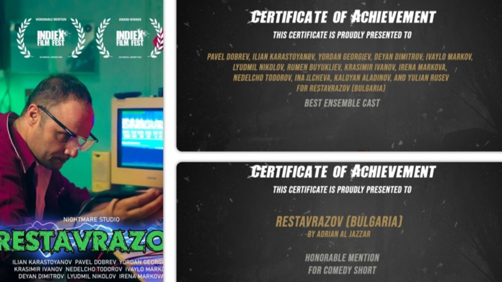 Короткометражный фильм «Реставразов» Адриана Ал Жазара из Силистры завоевал первый приз в номинации «Лучший актерский состав» и третий приз в номинации «Лучшая комедия» на международном кинофестивале IndieX в Голливуде.