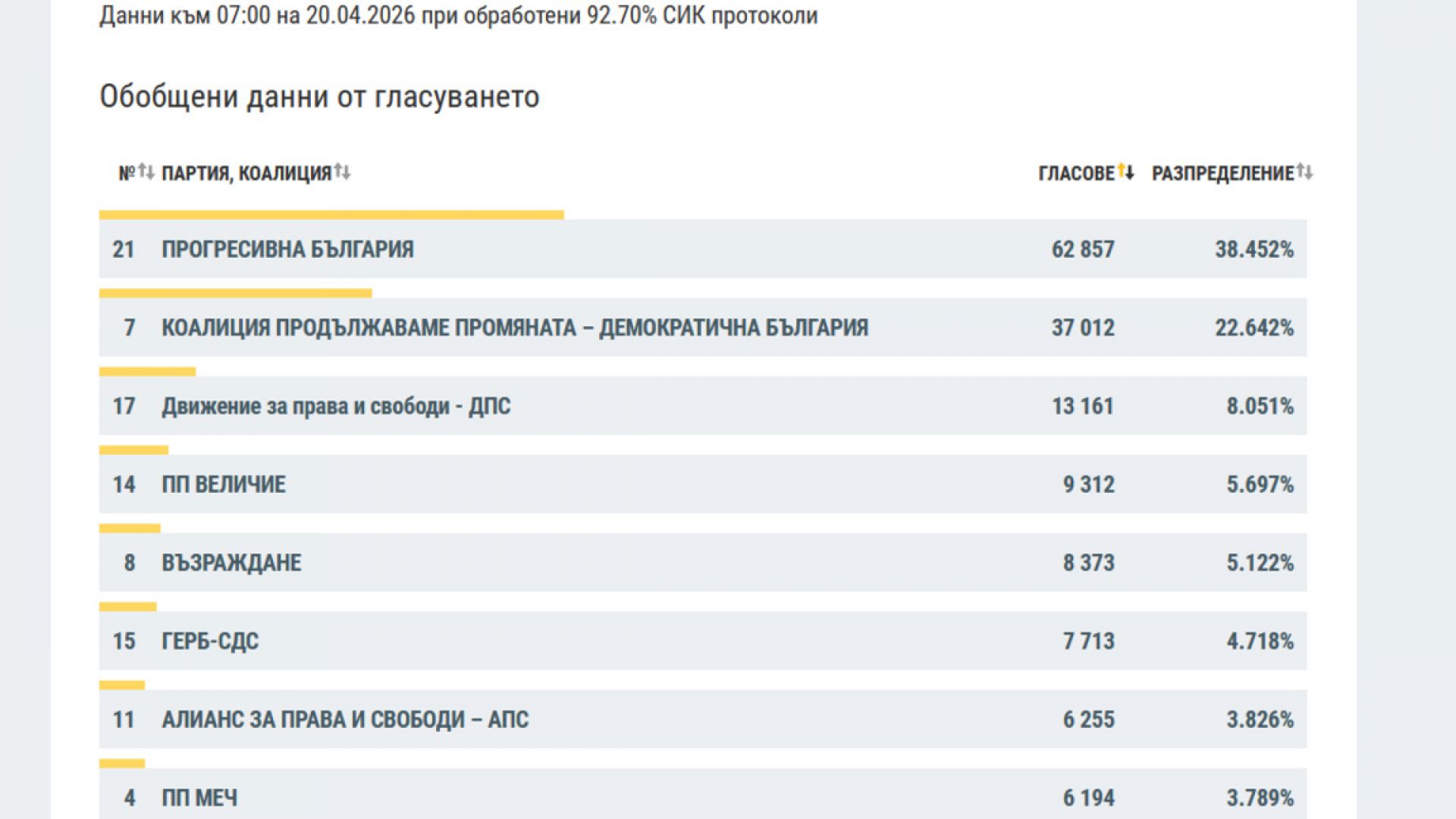 На втором месте по голосам за рубежом коалиция «Продолжаем перемены – Демократическая Болгария», которую поддержали 37 012 избирателей (22,642 %). На третьем месте «ДПС – Новое начало» с 13 161 голосом (8,05 % поддержки). ГЕРБ занимает лишь шестое место, уступая партиям «Величие» и «Возрождение».